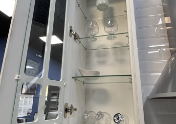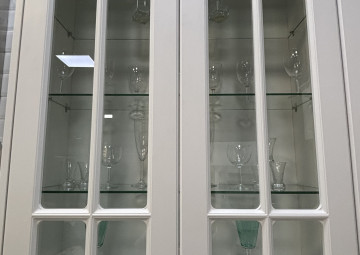 В шкафу-витрине установлены полки из прозрачного белого стекла — стильно и практично, отлично подходит для демонстрации посуды или декора.