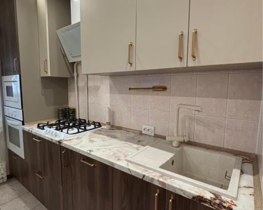 Кухня в современном стиле с темными деревянными фасадами и мраморной столешницей