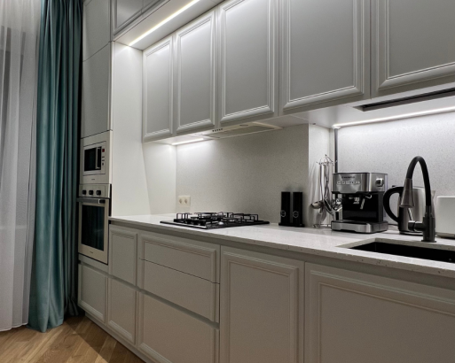 Столешшница - постформинг 38мм Аргиллит белый, багет крашеный МДФ, профиль Volpato золото, выдвижные системы Hettich, петли Sensys Hettich