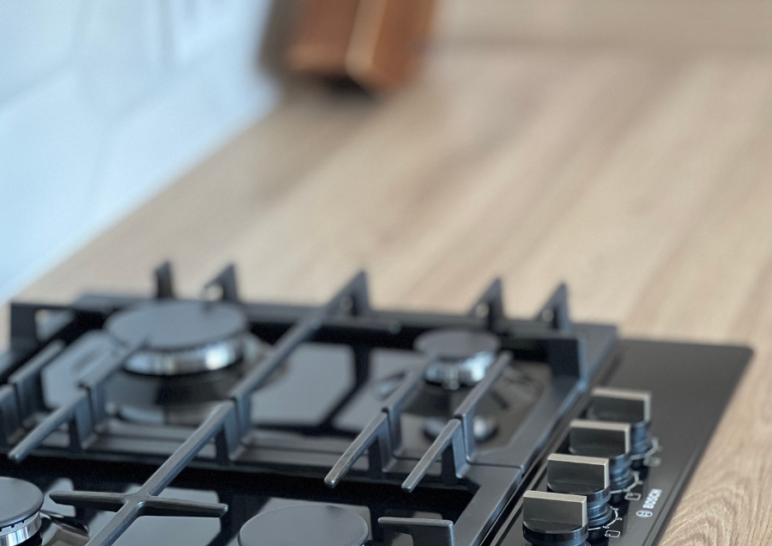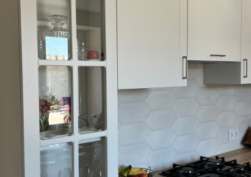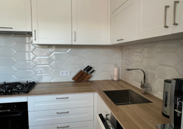 Современная кухня с белыми фасадами и деревянной столешницей