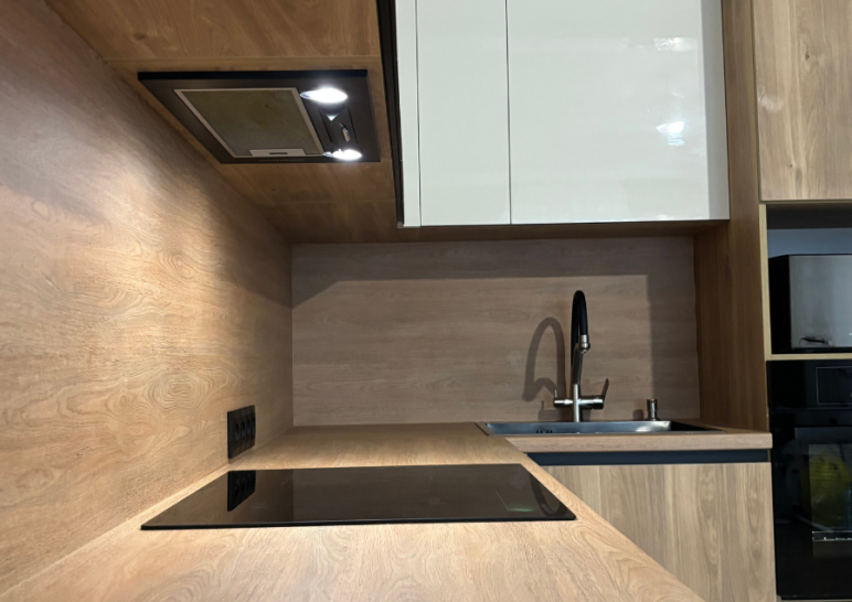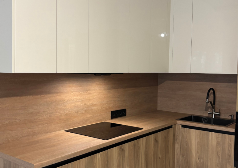 Современная угловая кухня с фасадами под дерево и глянцевыми верхними шкафами