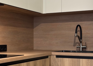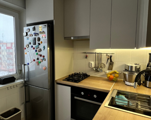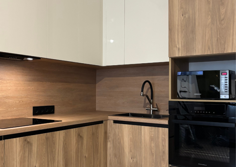 Стильная кухня с серыми фасадами и деревянной столешницей