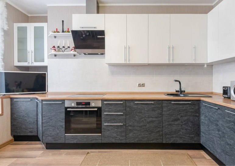 Стиль гарнитура приближен к лофту. Нижняя часть мебели выполнено в неоднородном темно-сером цвете, верхняя — в белых тонах, столешница выполнена под дерево. Такое сочетание оживляет пространство, визуально разгружает его, создает определенные акценты. Завершают цветовую композицию серебристые ручки-рейлинги. В дизайне преобладают глухие фасады, которые скрывают посуду и другие предметы. Изюминку придает навесной шкаф-витрина с матовым стеклом.