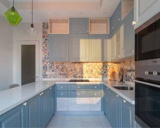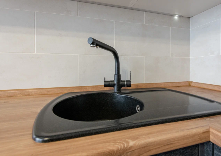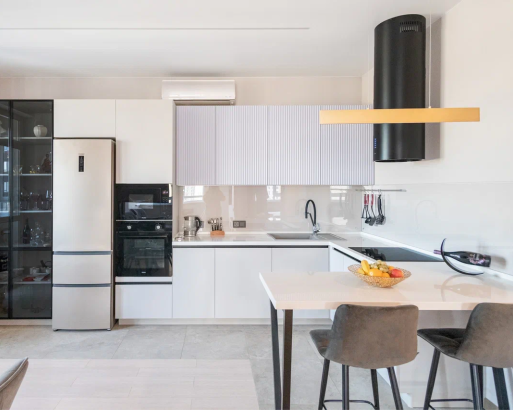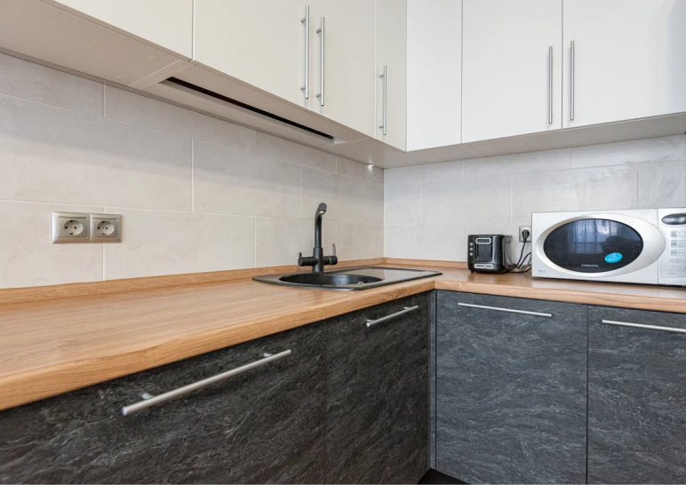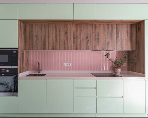 Для реализации проекта были использованы безопасные и прочные материалы — ЛДСП, МДФ и HPL-пластик. Они не вызывают аллергии, не горят при высоких температурах, не деформируются при контакте с влагой. Такой гарнитур способен прослужить много лет.