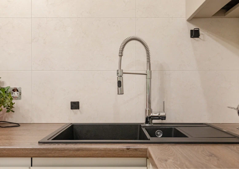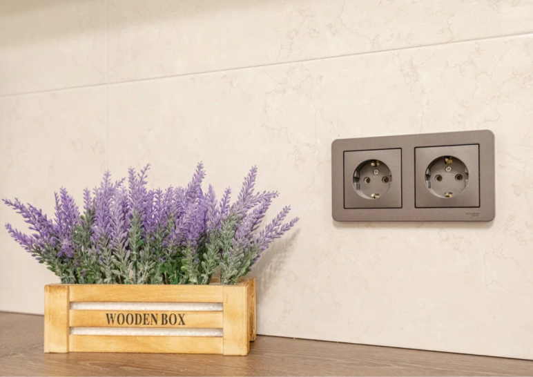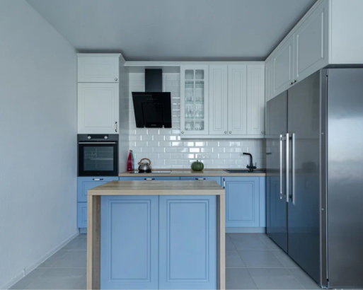 Для дополнительного удобства в проекте предусмотрены розетки, широкая рабочая зона, вместительная мойка с островом и различные держатели на стенах.