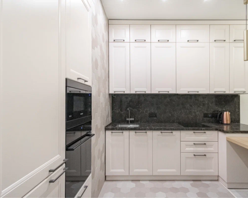 Еще одно преимущество — простота уборки. У гарнитура гладкие матовые фасады. На них практически не остаются следы пальцев, менее заметна пыль. Чтобы содержать мебель в чистоте и порядке, нужно регулярно протирать ее тканью или губкой. При этом комплект выдерживает как сухую, так и влажную уборку. Поверхности с ПВХ-покрытием, ЛДСП и МДФ в основе не деформируются под воздействием повышенной влажности, пара, перепадов температур. Гарнитур устойчив к механическим воздействиям и ультрафиолетовым лучам. Благодаря таким характеристикам он будет радовать вас долгие годы.