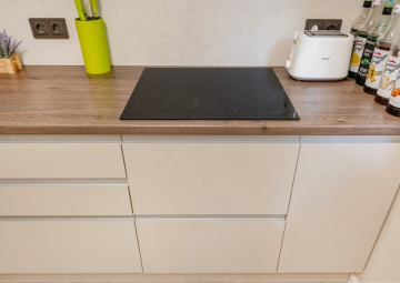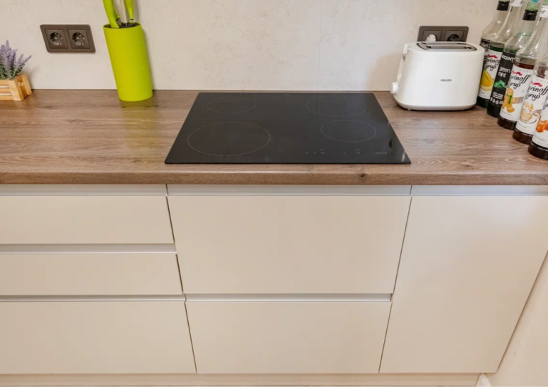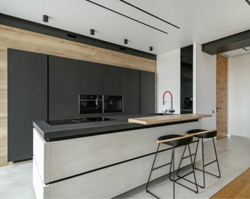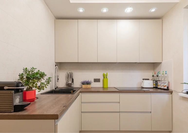 Мебель изготовлена в светло-бежевом оттенке. Фасады оттеняет столешница под темное дерево. Такое сочетание делает пространство светлее, визуально больше, уютнее и теплее. Дизайн не перегружен деталями. Дверцы оснащены механизмом Push to open и интегрированными ручками. Это значит, что на фасадах нет ни одного выступающего элемента.